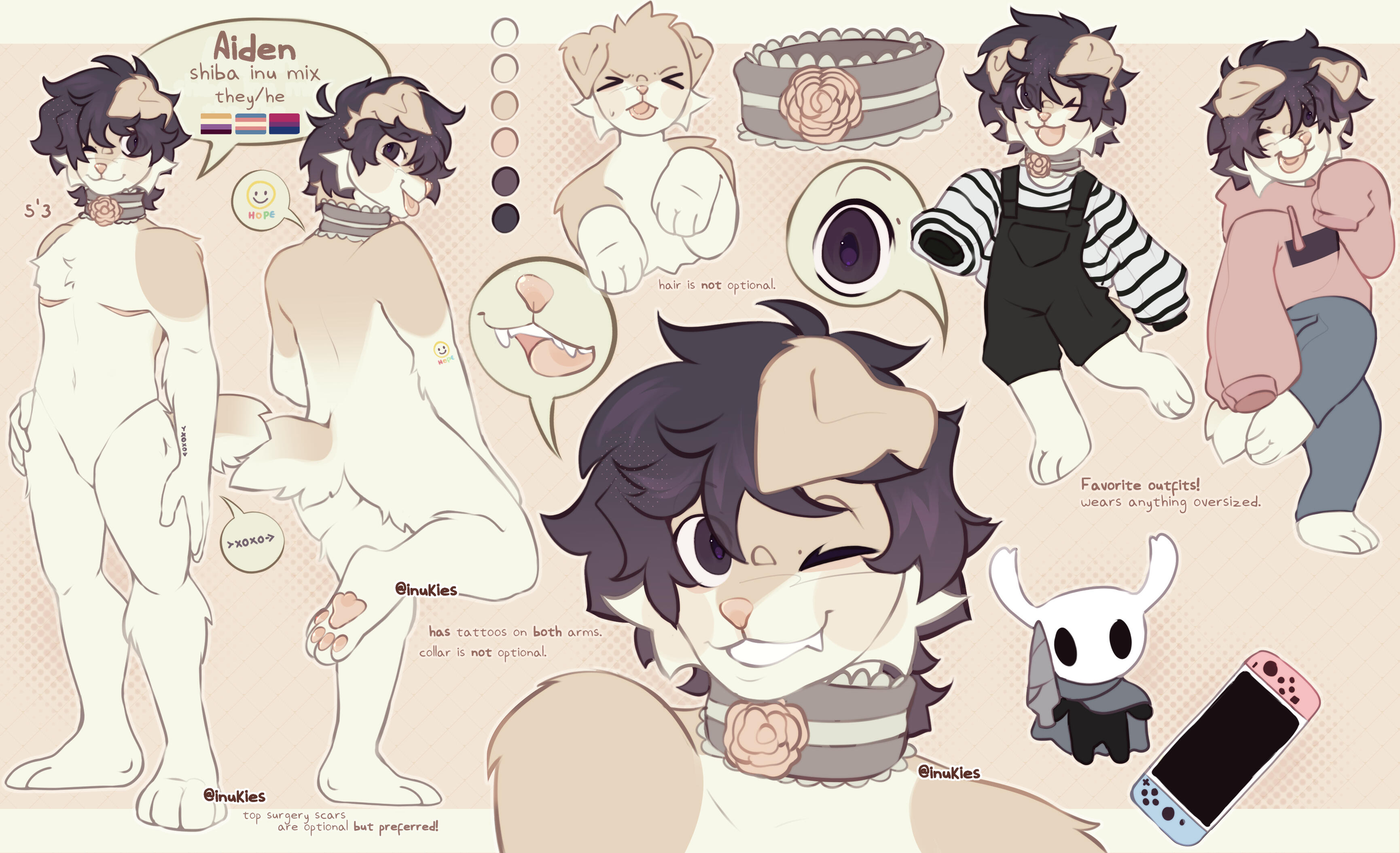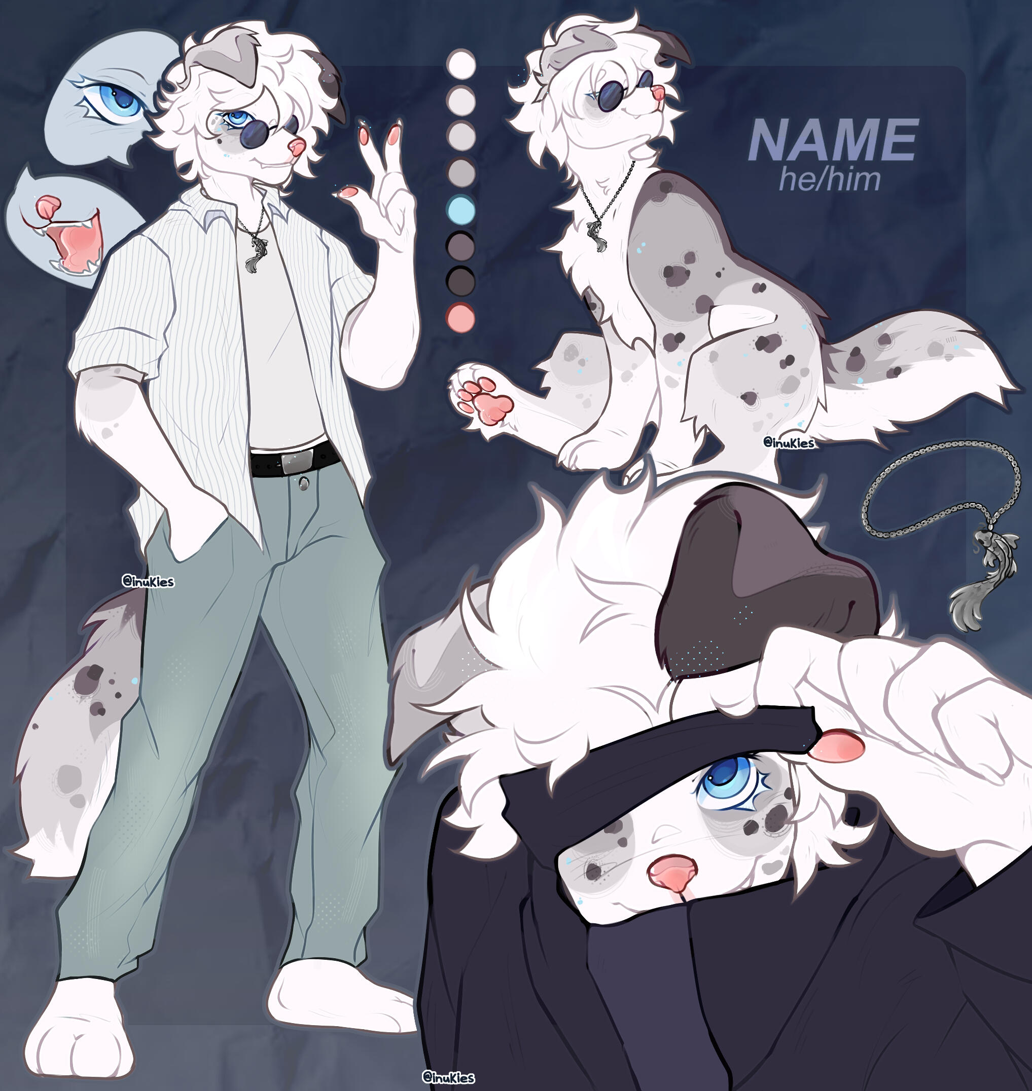every layout includes color pallete, up to three items and close-ups, as well as your character's name, pronouns, flags and any additional & relevant information.
